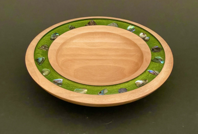 Bowl with Paua shell inlayed in resin. Finished with Carnauba wax. Diameter: 190mm, height 45mm.
