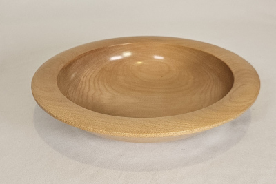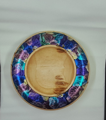 Ash platter. 245mm x 60mm. Sealed with nitrocellulose sanding sealer. Rim has Iridescent acrylic paint over matt black enamel.