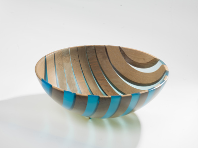 Ancient Kauri and resin coloured ocean blue ( graduated )joined in the shape of a traditional ocean shell. The bowl has been turned to 8ml thickness to let the light filter through the resin as it would with Ocean water. 350 dia 130 high finish 30% lacquer gloss.