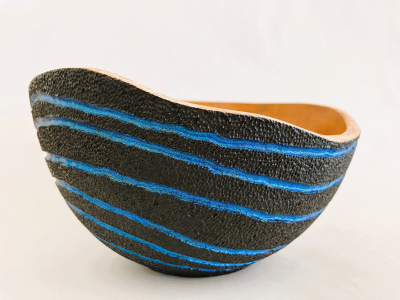 "Black Tiger" Using Yakisugi technique with carved flutes on Japanese Cedar which give the wood a three dimensional look of motion, several coats boiled linseed oil giving a rich golden colour, sealed with several coats of satin lacquer, 290mm diam X 250mm H