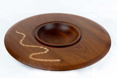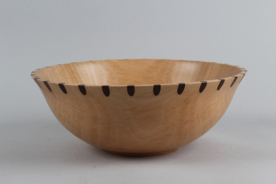 A large bowl made from London plane with 30 walnut inlays embedded in the rim. 270mm wide by 100mm high and finished in lacquer.