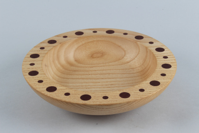 Ash bowl precisely decorated with Purple Heart inlays in an 'ornamental' style. 230mm diameter x 60mm deep. Oil sanded and finished with wax.