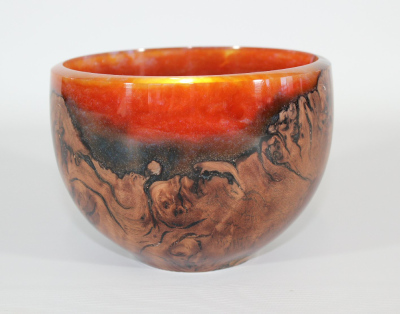 A rough old case-hardened Red Beech burr given a second chance with the addition of an epoxy resin rim. Reminiscent of sunset at the beach. 150 Dia. X 100 H. Epoxy, colours, iridescent powders. Mirotone pure Danish oil.