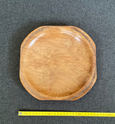 Wooden items which have been made from one or many pieces of wood into a bowl or platter shape which has been carved, decorated, coloured, textured, embellished or otherwise enhanced and remains functional.