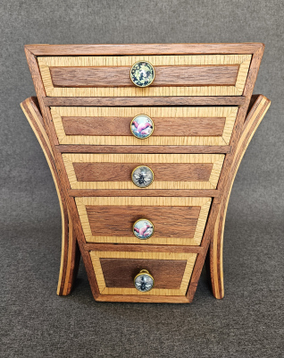 Steam bending combined with an unusual shape. The body and drawers are kwila, the borders on the drawer fronts are from oak laminate. The back, made from left over pieces makes a nice compliment to the front. Height 380mm