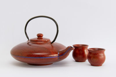 Oriental style teapot with two cups. Ironwood, epoxy resin, color shift mica powder, iron handle. Teapot width : 22cm. Cup width: 5cm.