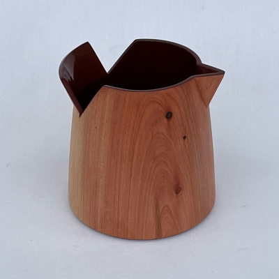 Alder end grain jug. Turned and carved by hand. Finished with several coats of neri bengara urushi to achieve a completely waterproof inside surface. The outside is finished with pure Danish oil and buffed with carnauba wax. 13 x 15 cm.
