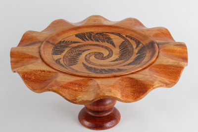 This elegant cake stand made of Oak (top) and Totara (bottom) is ideal for displaying Cakes, cookies or muffins at a party. Pyrography of Koru (Maori fern symbolizing new life) beautifies the top. H: 200 mm. D: 400 mm.